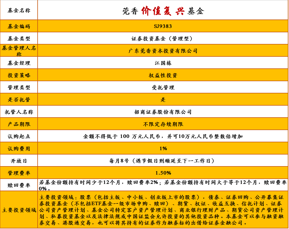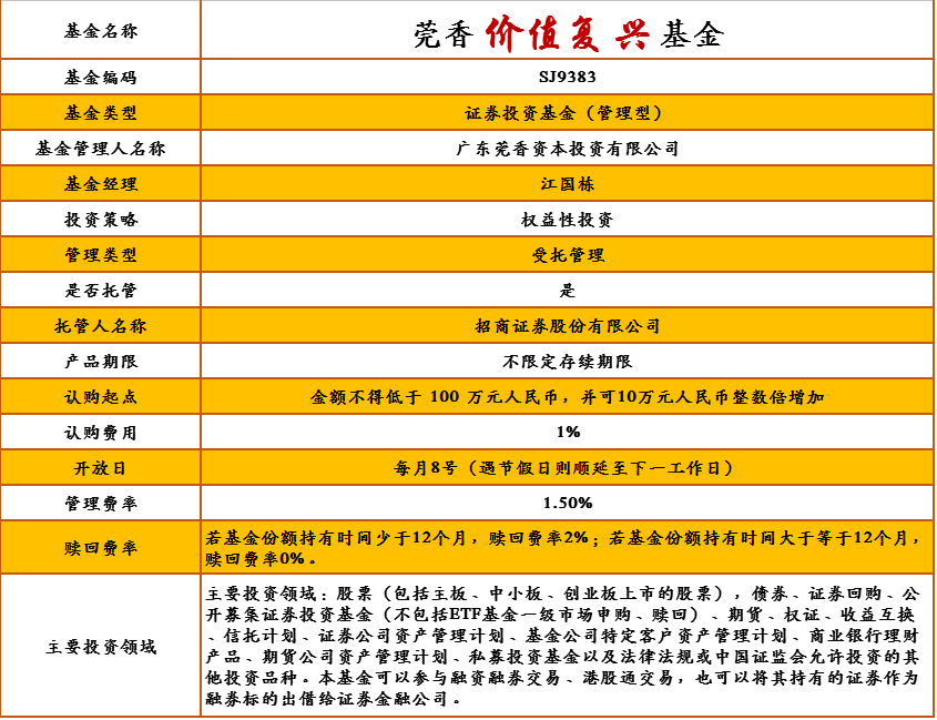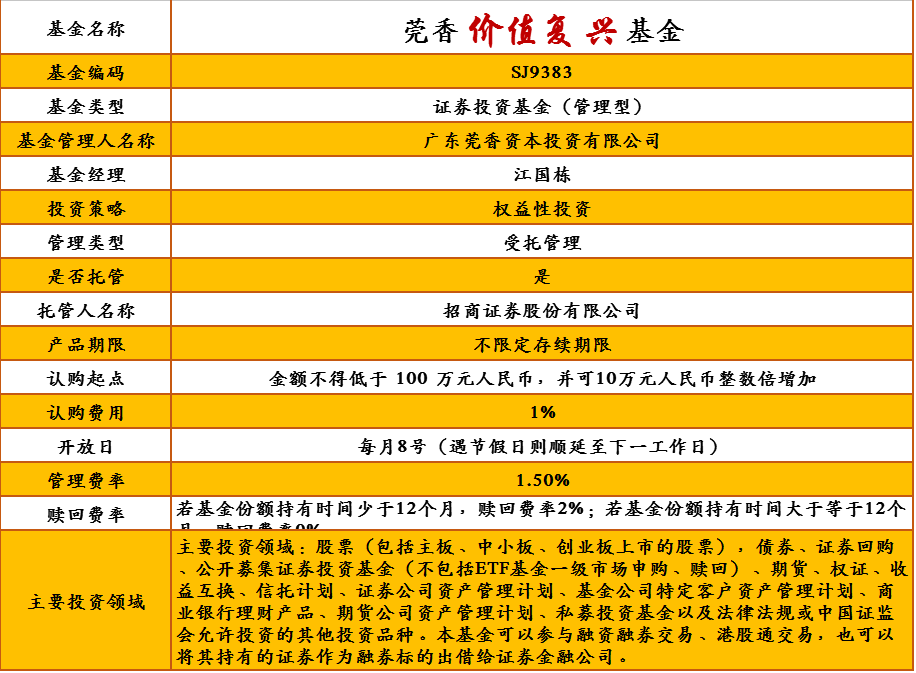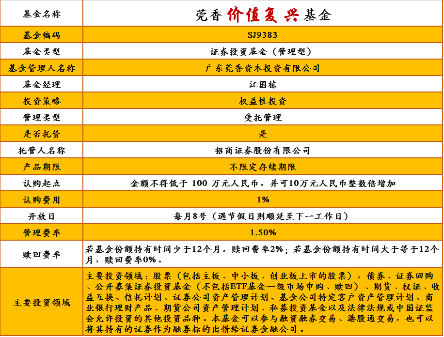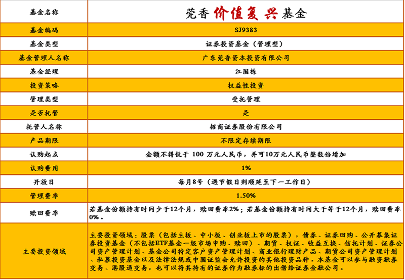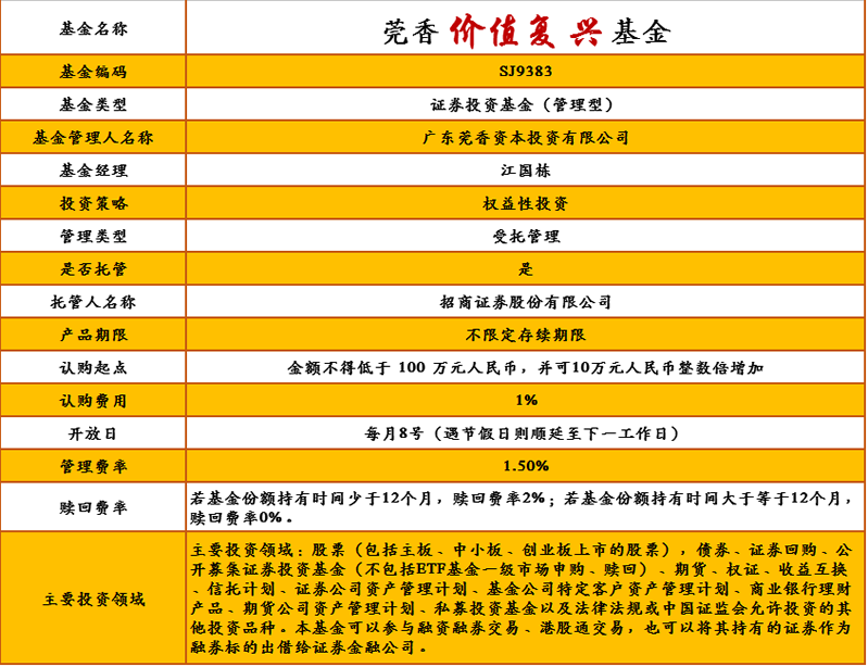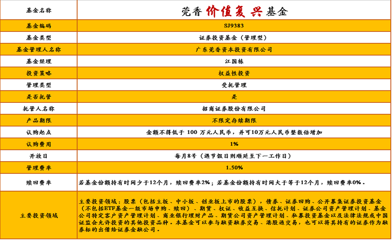 莞香价值复兴基金管理人为广东莞香资本投资有限公司,托管人为招商证券股份有限公司。详细产品要素,详见下表: