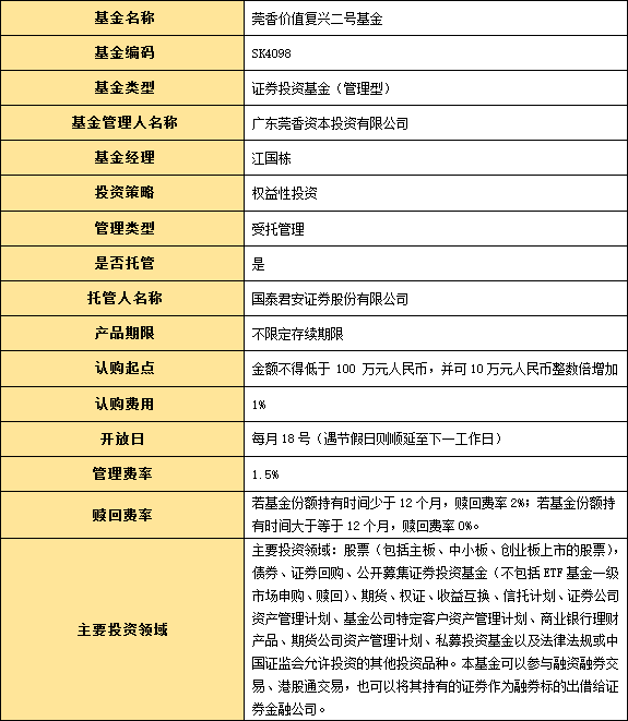 根据《证券投资基金法》和《私募投资基金监督管理暂行办法》等法律法规的相关规定和要求,我司成立莞香价值复兴二号基金,该基金已向中国证券投资基金业协会备案,并获准发行,目前处于运作状态。 莞香价值复兴二号基金管理人为广东莞香资本投资有限公司,托管人为国泰君安证券股份有限公司。详细产品要素,详见下表: